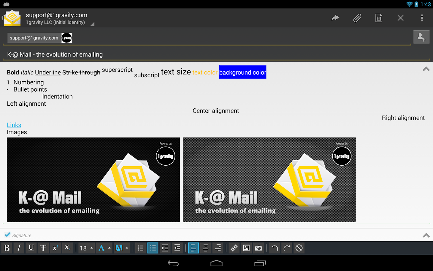★ Rich-text editor to format text including the signature: bold, italic, underline, strike-through, superscript, subscript, text size, text color, background color, numbering, bullet points, indentation, left/center/right alignment, links, images, undo/redo.