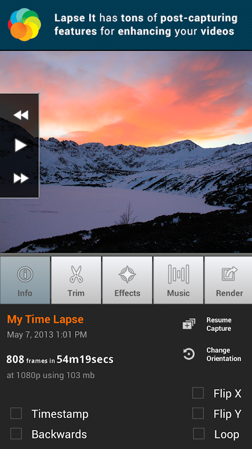 Lapse It is the ONLY app in the Market with this powerful render engine, and the only one that really works rendering the videos in the Android proper format, so you can easily watch the videos on your phone, share it across the web and with other devices.